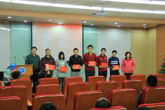 晚会开始,首先由天文系系主任刘富坤教授致辞,刘老师总结了过去一年里天文系师生在科研活动方面的重大进展和研究亮点,并对大家送上了新年的祝福。 接着科维理所所长Luis Ho教授深情回顾了他履职一年来的心路历程, 畅谈了KIAA在过去一年举办的各类活动以及取得的各项成绩,并对所有员工的付出表示了感谢。 随后,国家天文台的郝晋新副台长致辞, 作为北大毕业生的郝台向大家介绍了未来我国天文发展的重大机遇, 诚挚地邀请天文系学生毕业后能到天文台工作。接着他和杜红荣处长为六名天文系的本科生颁发了国台奖学金并合影留念。奖学金颁发完毕后,博士生刘项琨对2014年本科生、研究生活动进行了总结。