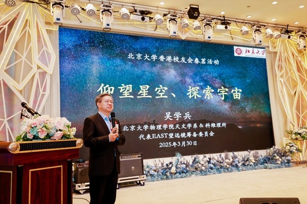 3月30日:应北京大学香港校友会刘祖繁会长的邀请,吴学兵教授作为嘉宾出席了在香港尖沙咀举行的北京大学香港校友会2025蛇年春茗活动,并代表EAST望远镜筹委会作了“仰望星空、探索宇宙”的报告,介绍了天文望远镜的发展以及EAST通用光学望远镜计划。约300名北大校友和嘉宾参加了这一活动。