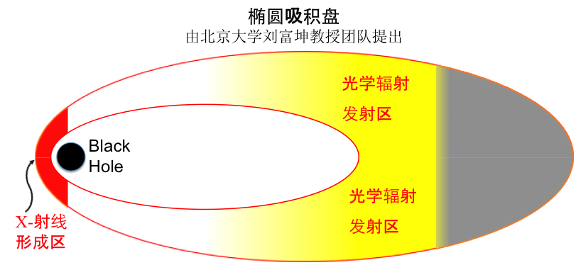北京大学物理学院天文系和科维理天文与天体物理研究所刘富坤教授领导的研究团队提出了一个物理上完全不同的新型椭圆盘模型(见示意图)。在该吸积盘模型中,软X-射线光子在椭圆盘绕黑洞的近心点处产生,形成后被电子散射囚禁在吸积盘物质内,随物质一起绕黑洞旋转(类似光纤)。这些软X-射线光子在随物质一起绕黑洞作椭圆绕转的过程中光致电离吸积盘物质。被电离的物质在复合时,发射出低频连续谱和光学发射线。在最近发表在国际著名天体物理杂志ApJ的论文中,刘富坤带领团队研究了该理论模型的动力学和热辐射性质,并非常漂亮地回答了那些严峻挑战传统圆化吸积盘模型的难题。北京大学的博士研究生曹春洋、曹荣、周智勤,波兰尼古拉斯·哥白尼天文研究中心的Marek Abramowicz教授以及哈佛大学的Maciek Wielgus博士是论文的共同作者。