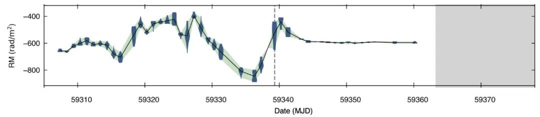图1:法拉第旋转量的短时标演化。阴影区有FAST观测,但是没有探测到FRB暴发,说明FRB是突然熄灭的。