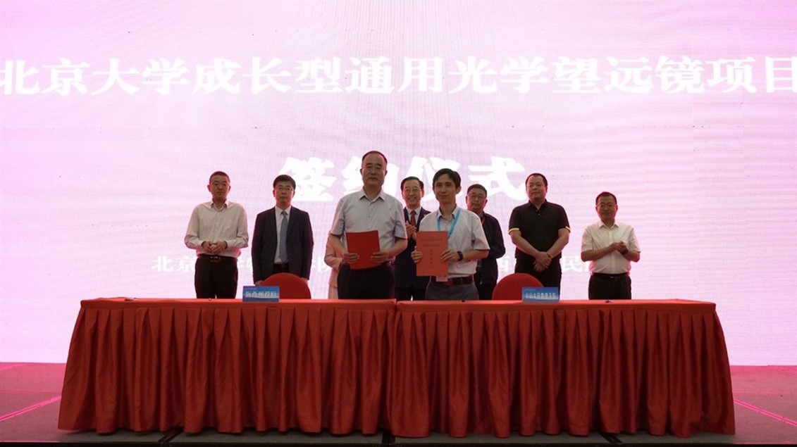 7月21日: “冷湖天文科技产业发展”论坛在青海省西宁市举办。青海省海西蒙古族藏族自治州人民政府副州长张银廷、青海省科技厅副厅长苏海红等出席论坛。北京大学物理学院副院长颜学庆教授和院长助理、天文学系副系主任黎卓研究员等几十名专家学者参加了论坛。在签约活动环节,颜学庆与张银廷分别代表北京大学物理学院与青海省海西蒙古族藏族自治州人民政府签署了《成长型通用光学望远镜项目合作协议》。双方将牵头在青海省冷湖天文观测基地合作建设成长型通用光学望远镜(EAST),为我国科学家打造一台6-8米口径、世界一流的多样化光学波段观测利器。