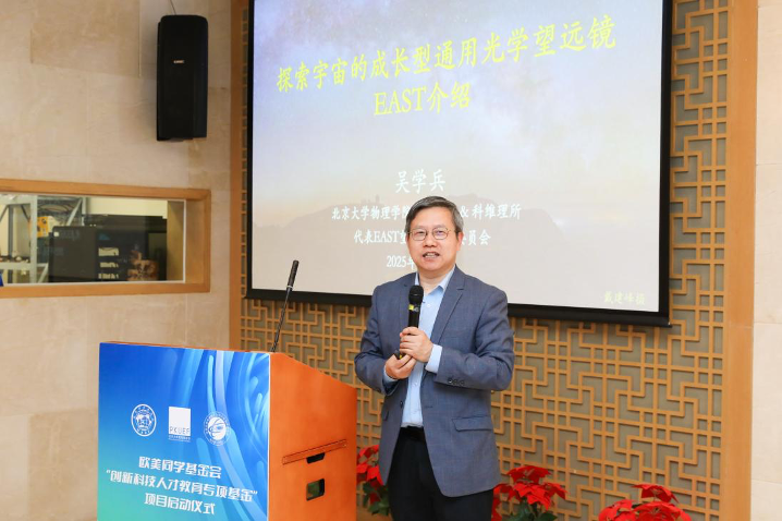 5月3日:欧美同学基金会创新科技人才教育专项基金项目启动仪式暨欧美同学基金会向北京大学科维理天文与天体物理研究所捐赠仪式在北京大学教育基金会隆重举行,随后在科维理所举行了2025年北大天文星空Party,100多位嘉宾参加。北京大学天文学系教授吴学兵在启动仪式上对EAST望远镜作了介绍。他表示,望远镜是人类探索宇宙最重要的工具。近年来,中国天文事业取得了飞速发展,但在中大型光学望远镜方面,与世界强国还有很大差距。北京大学牵头提出利用拼接镜面技术尽快建成一台口径6-8米的成长型通用光学望远镜(EAST),希望能迅速缩小与国外差距,取得一流科学成果。EAST作为“全能型”的大口径光学望远镜,能为建设更大型的地面和空间光学望远镜积累必要的技术经验,希望得到各单位和社会各界的关注与支持!