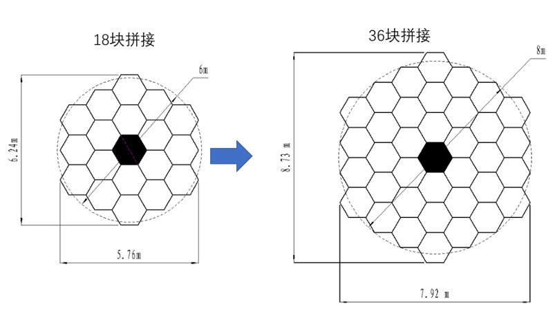 采用拼接镜面既有效节省了建设成本,也使得望远镜的扩展和维护变得更加方便,每块六角形子镜可以单独研制和维护。根据预算和科学目标要求,EAST望远镜的主镜口径将与公众的关注和支持同步成长,由6块子镜逐步成长到18块子镜和最终的36块子镜。