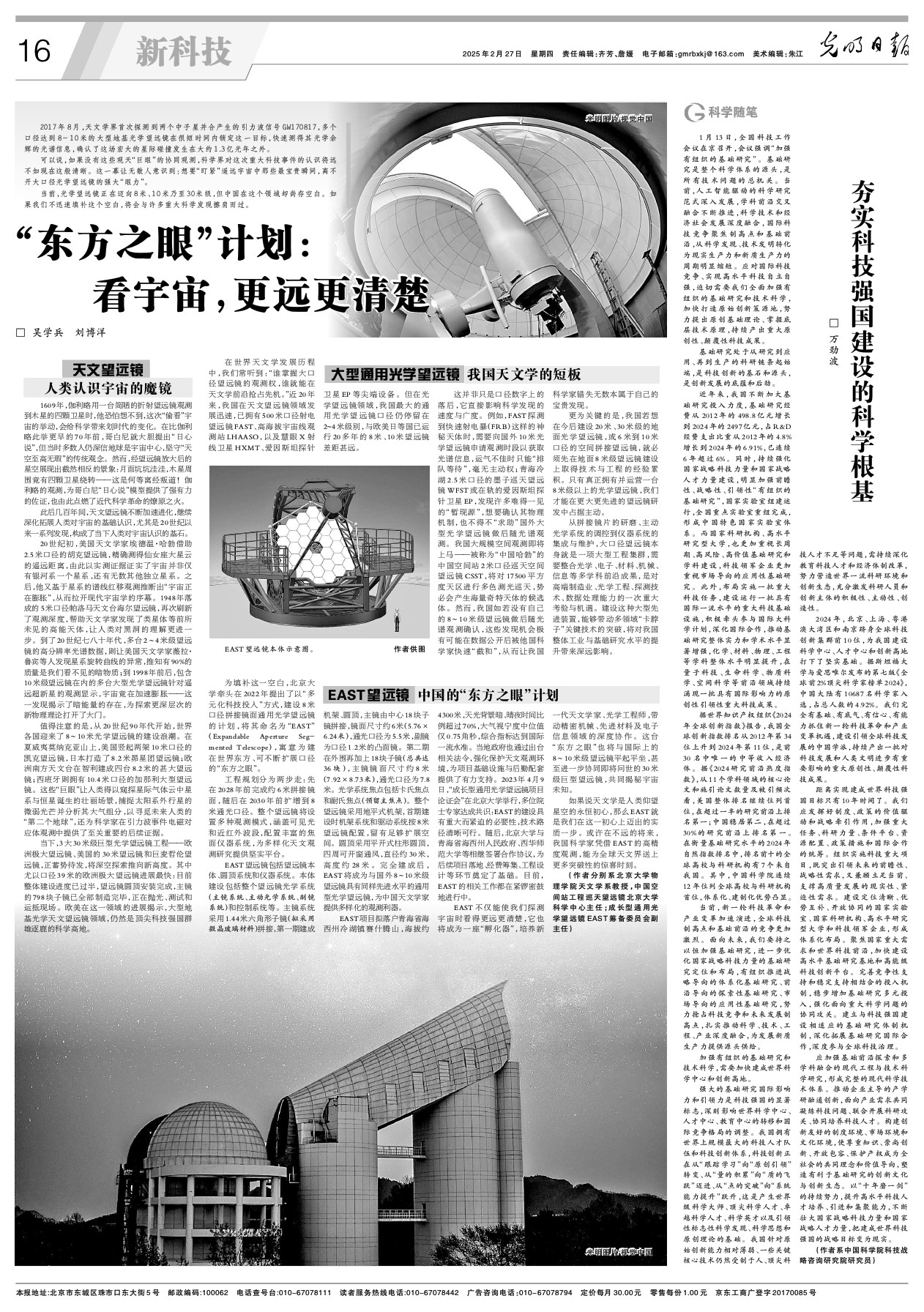 2月27日:光明日报第16版发表吴学兵、刘博洋的文章““东方之眼”计划:看宇宙,更远更清楚”,介绍了EAST望远镜计划。内容包括:天文望远镜:人类认识宇宙的魔镜;大型通用光学望远镜:我国天文学的短板;EAST望远镜:中国的“东方之眼”计划。