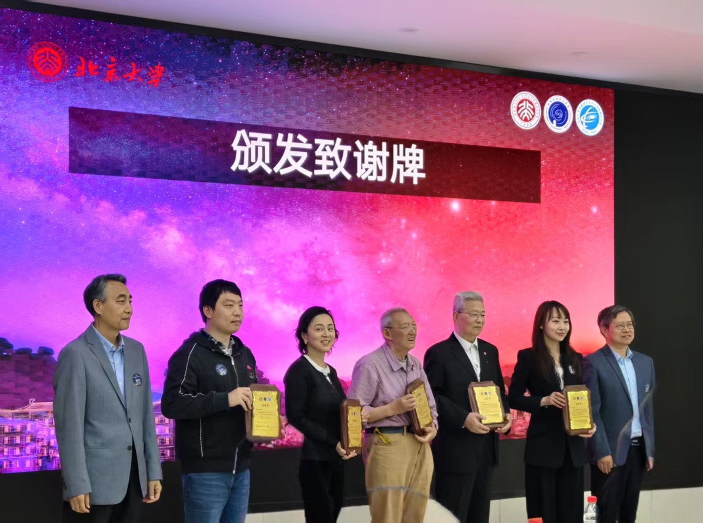 随后,张华伟教授和吴学兵教授向欧美同学基金会、陈建生院士、李启斌基金会理事长李亦非女士、北大校友彭亮博士(由其父亲彭秋和教授代领)、舒琦博士等近年来为天文学项目作出慷慨捐赠的单位和个人颁发了致谢状。李亦非女士作为捐赠者代表发言,她深情回忆父亲李启斌先生生前长期担任北京天文台(国家天文台前身)台长的经历,父亲的言传身教深深烙印在她心里。她捐资设立“李启斌奖助学金”希望能助力北大培养更多杰出的天文学人才,期待更多人关注天文学,助力北大EAST望远镜项目,共绘中国天文学蓬勃发展的壮丽画卷。