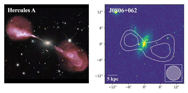 左图:经典射电星系Hercules A,其宿主星系为巨椭圆星系;右图:本工作发现的特殊射电星系,其宿主星系为盘状星系。右图显示了哈勃望远镜 F475W 波段星系图像与 FIRST 1.4 GHz 波段的射电喷流轮廓,图右下角带阴影的椭圆表示射电望远镜的波束大小。