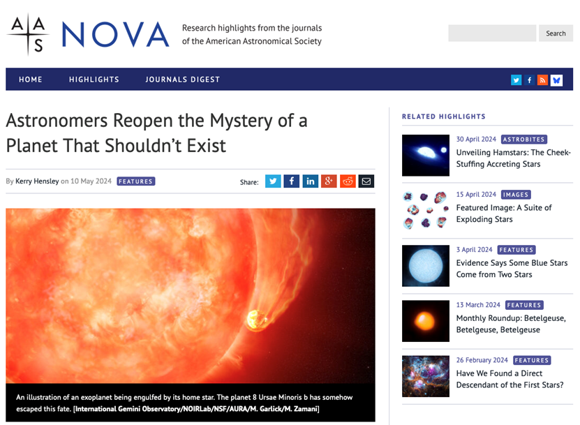 近期,来自北京大学、中国科学院大学、国家天文台、清华大学以及美国圣母大学的学者组成的国际研究团队,利用Gaia天体测量数据和SOPHIE高分辨率光谱,以及LAMOST等分光样本构建的年龄-运动学/元素丰度标度关系,对一颗拥有近距离行星的红团簇巨星的年龄进行了计算,为理解该系统的形成与演化提供了重要限制。论文第一作者为北京大学天文系博士研究生陈慧玲,通讯作者为中国科学院大学黄样副教授和北京大学张华伟研究员。该研究成果发表于国际专业学术期刊《天体物理学报通讯》(2024, ApJL, 966, L27),正式发表后即被美国天文学会(AAS)Nova网站选为研究亮点,以《谜云再现:不可能存在的行星之谜》(Astronomers Reopen the Mystery of a Planet That Shouldn’t Exist )为题在网站头条报道(见图1)。